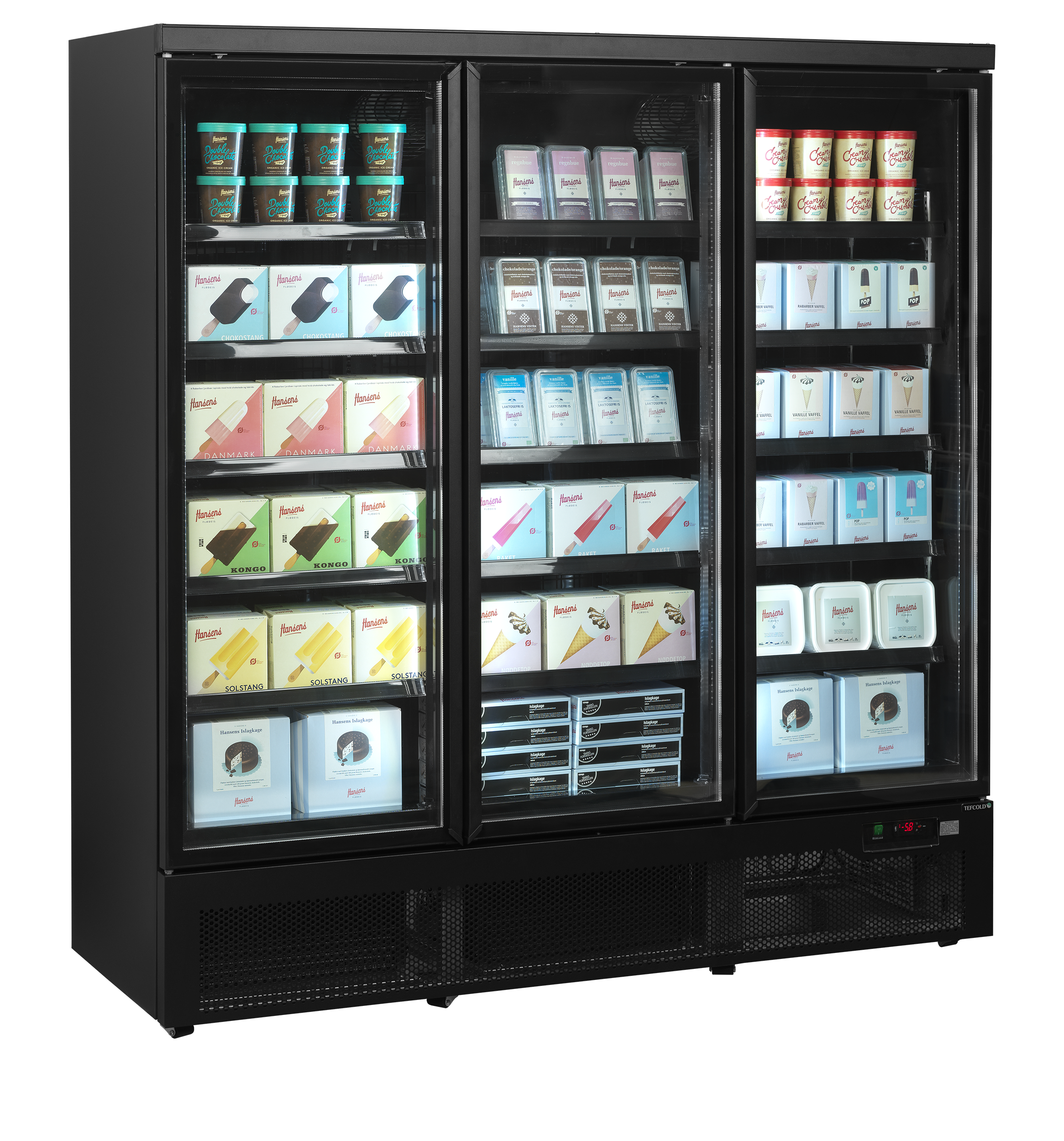 Sort displayfryser med justerbare hylder.