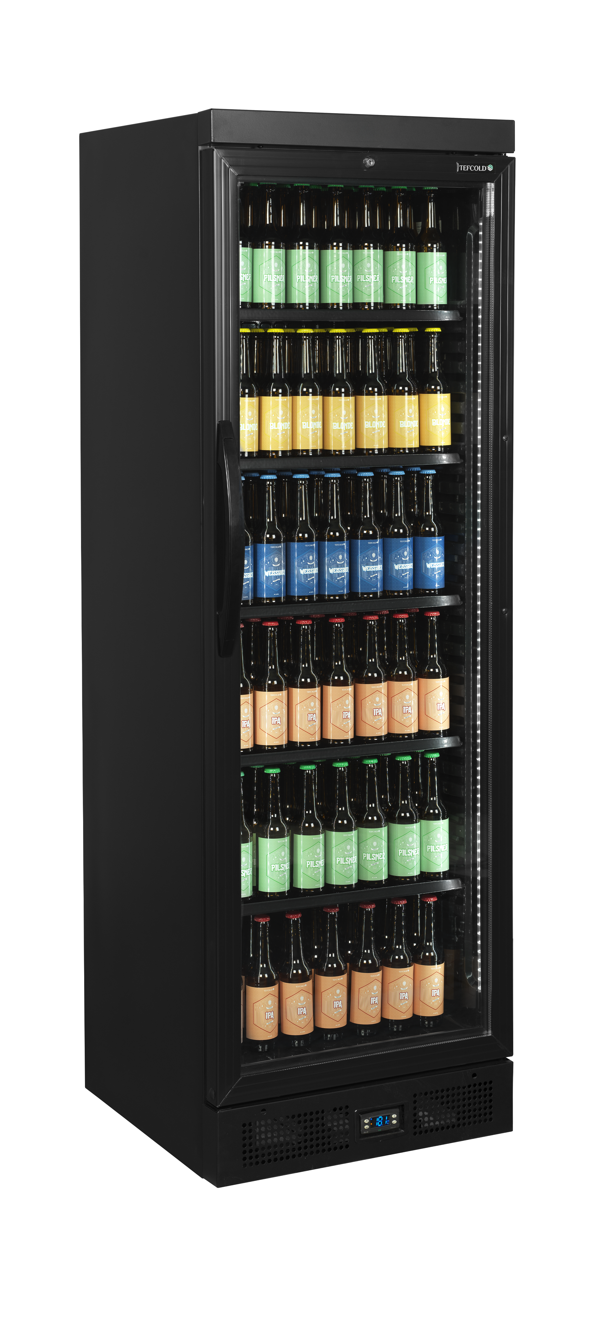 CEV er vores bedstsælgende serie af flaskekøleskabe. Den har alt, hvad der skal til for at udstille iskolde drikkevarer på den bedst mulige måde: en glasdør med LED belysning på indersiden af dørrammen, justerbare hylder for øget fleksibilitet, køling med ventilator for en jævn temperatur i skabet - og så er den ovenikøbet ideel til dekorering. Den fås som standard med højrehængt dør så vel som venstrehængt dør.