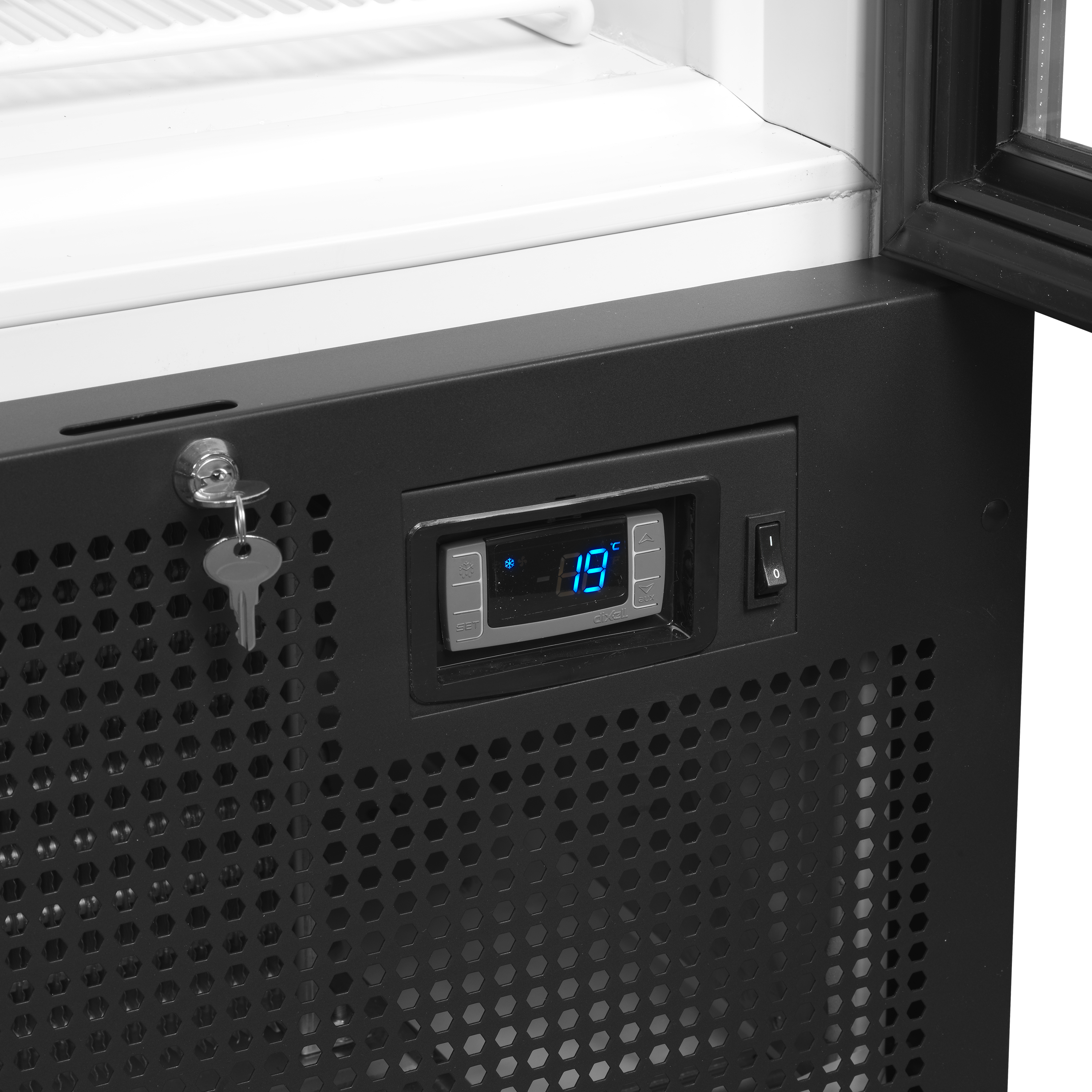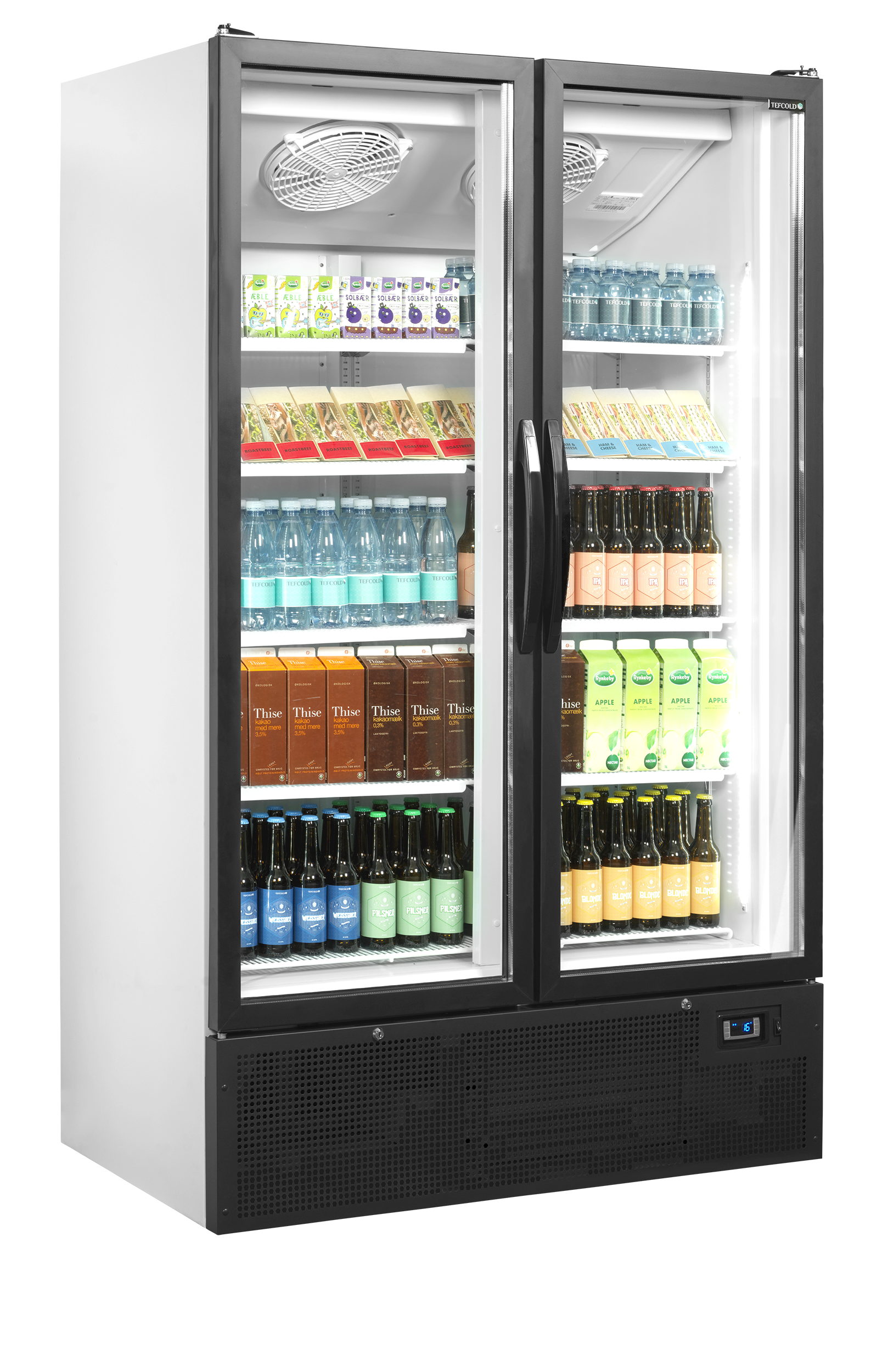 2-dørs displaykøler med hængslede døre.