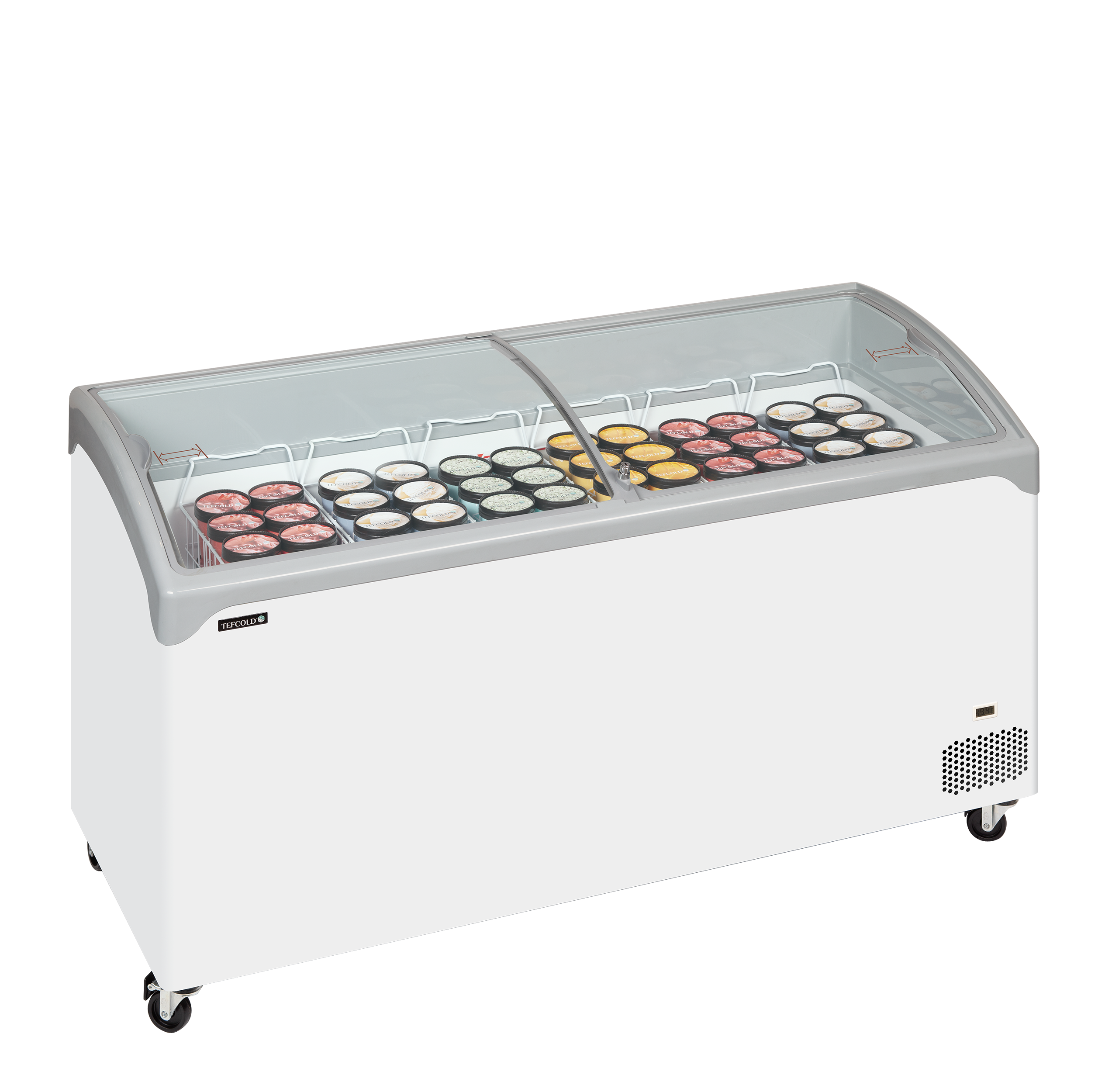 NIC-SCEB er en serie af isfrysere i høj kvalitet, designet med rundede hjørner og kanter samt buede skydelåg i glas. Det er en solid og stabil fryser, der let kan flytte placering i forretningen, da den står på hjul. Den er oplagt til udstilling af diverse frosne madvarer, heriblandt vafler og ispinde. Komplet sæt kurve medfølger.