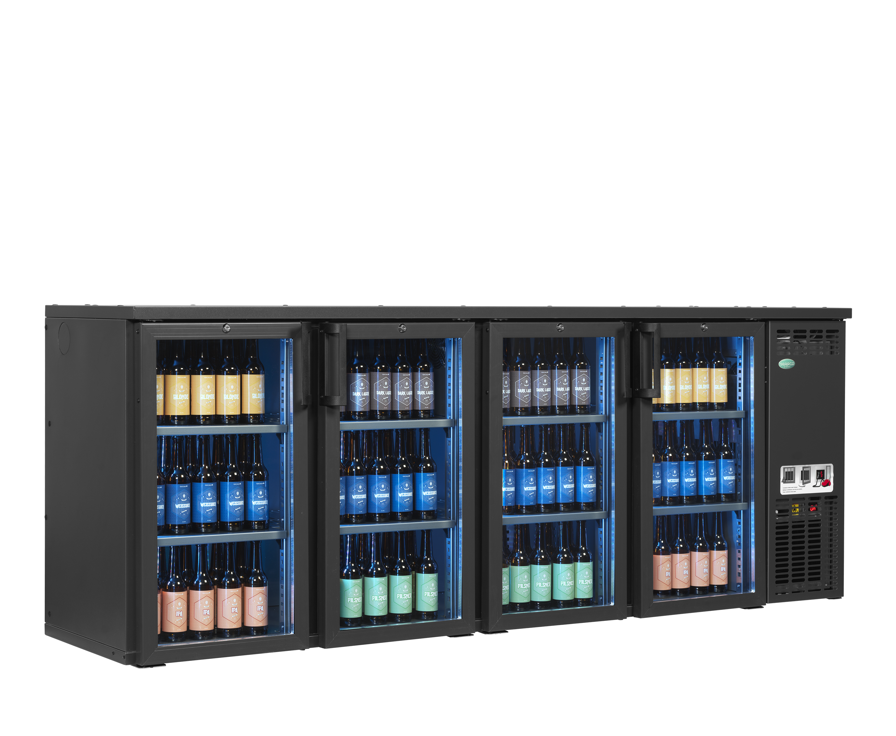 SCL-GMU+ Combi-Line fra Serrco tilbyder en unik produktpræsentation. Den er udstyret med LED-farvebelysning, og du kan tilpasse lysets farve og intensitet, så det passer til din baratmosfære ved hjælp af den medfølgende fjernbetjening. Du får også den smarte Serrco-køle løsning med en aftagelig køleenhed, der reducerer servicetiden fra timer til blot få minutter, så du altid har kolde drikkevarer klar til dine gæster.