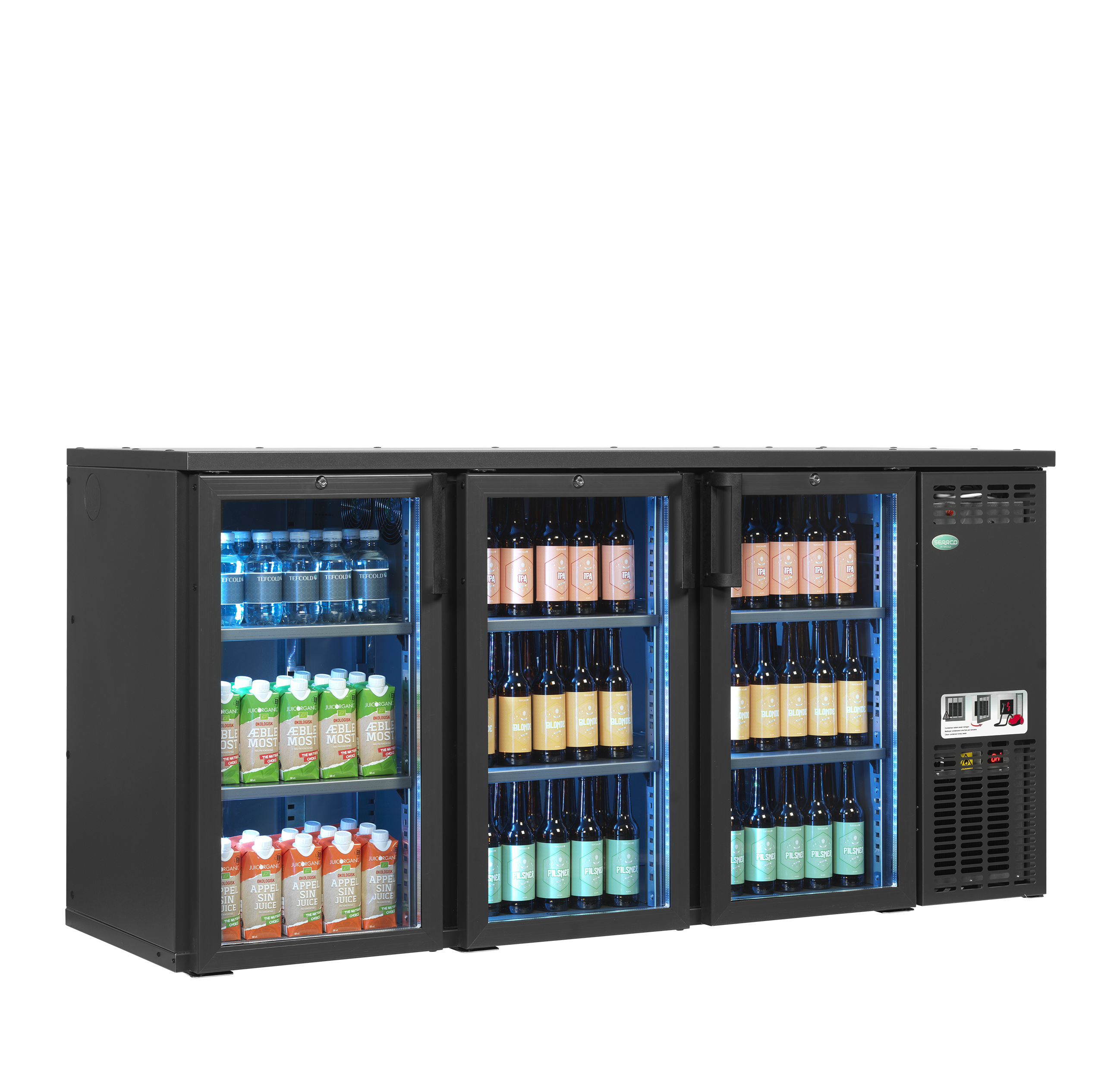 SCL-GMU+ Combi-Line fra Serrco tilbyder en unik produktpræsentation. Den er udstyret med LED-farvebelysning, og du kan tilpasse lysets farve og intensitet, så det passer til din baratmosfære ved hjælp af den medfølgende fjernbetjening. Du får også den smarte Serrco-køle løsning med en aftagelig køleenhed, der reducerer servicetiden fra timer til blot få minutter, så du altid har kolde drikkevarer klar til dine gæster.