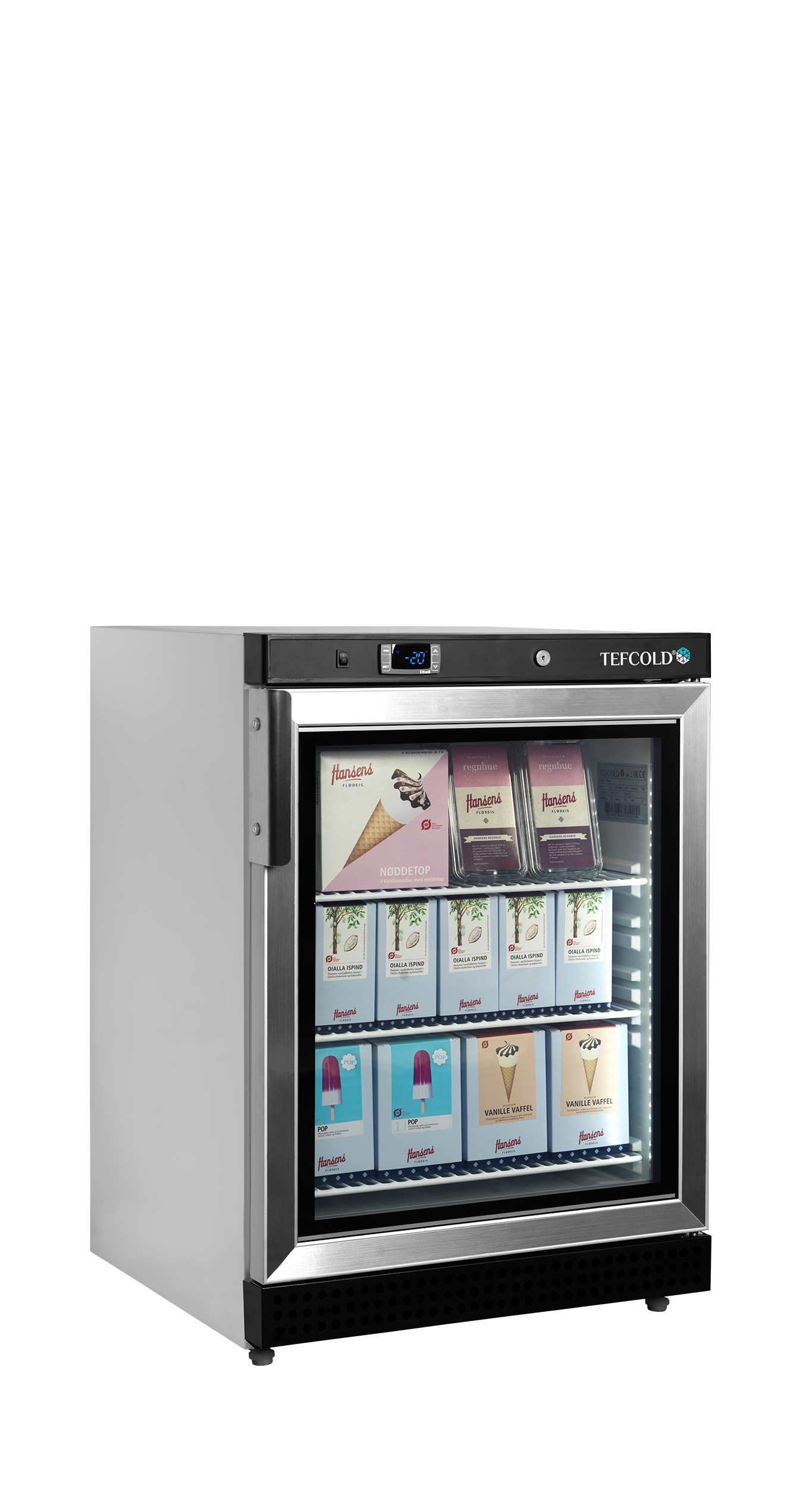 UF-VG er en serie af hvide displayfrysere med glasdør, der har ventileret køl. De fås i flere størrelser og tilbyder stor fleksibilitet med justerbare hylder. Fryserne har et effektivt ventileret kølesystem, der sørger for en ensartet temperatur i hele kabinettet. Temperaturen indstilles på en digital termostat. Afrimning sker automatisk.