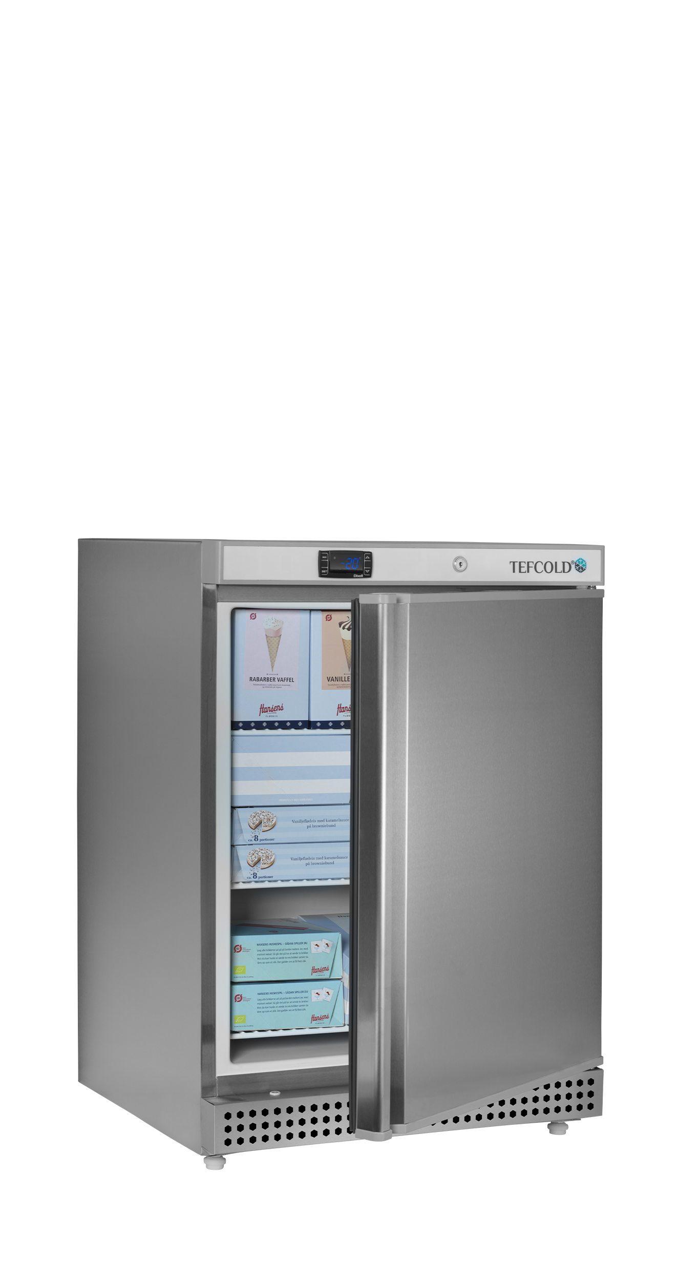 UF-VS er en serie af lagerfryseskabe i rustfrit stål, der fås i flere størrelser. Fryserne har et effektivt ventileret kølesystem, der sørger for en ensartet temperatur i hele kabinettet. Temperaturen indstilles på en digital termostat. Du kan let tilpasse fryserne til dine behov, da de har justerbare hylder. Afrimning sker automatisk.