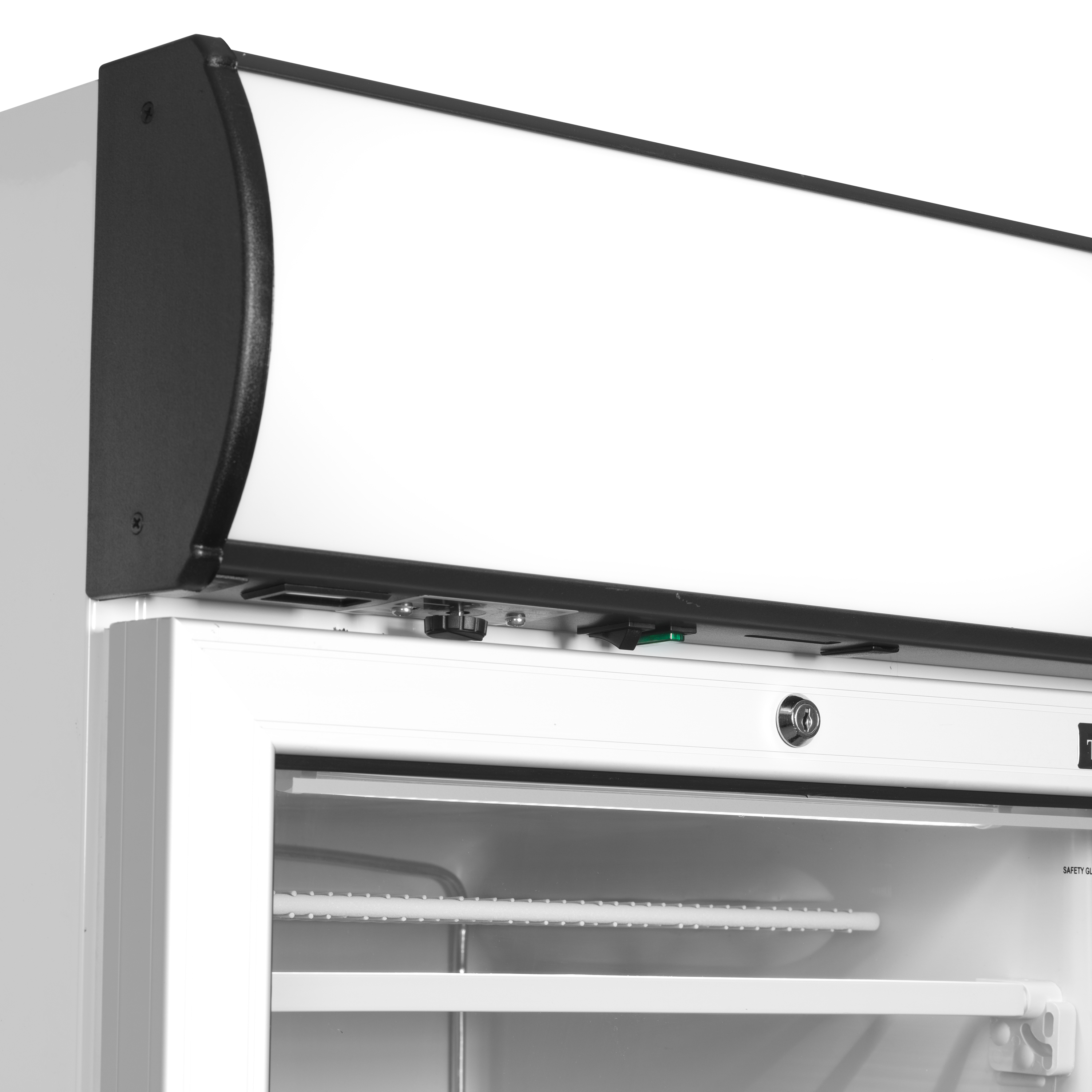 Displayfryser med lystop og glasdør.